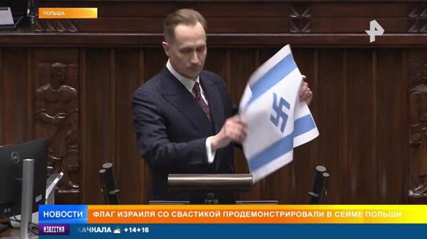Политику Израиля 14 апреля критиковали в Сейме Польши. На заседании один из депутатов развернул флаг еврейского государства, на котором, вместо "Звезды Давида" была изображена свастика.