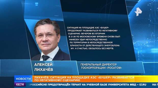 "Ситуация на площадке АЭС "Бушер" продолжает развиваться по негативному сценарию. Вечером во вторник в 21.00 по московскому времени снова был нанесен удар непосредственно по территории в непосредственной близости от действующего энергоблока №1. К счастью, обошлось без жертв", – подчеркнул Лихачев.