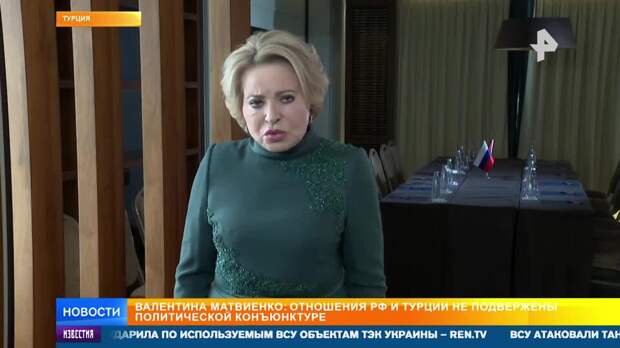 "Уважаемый президент Турции предложил опять Стамбульскую площадку для продолжение переговоров, и они занимают взвешенную позицию. Здесь у нас тоже продолжаются наши контакты, наше взаимодействие. Обсудили двустороннюю повестку, торговые наши экономические связи развиваются успешно, мы вышли на планку 60 млрд долларов по итогам прошлого года", – сообщила председатель Совета Федерации.