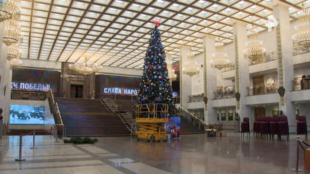 В Музее Победы в рамках проекта "Елка Победы" нарядили десятиметровую ель. В этом году праздничное дерево установили в Зале Полководцев.