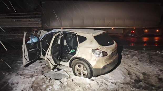 "Водитель автомобиля Nissan Qashqai не справился с управлением, совершил наезд на ограждение, а затем выехал на полосу встречного движения, где столкнулся с большегрузом Scania", – говорится в сообщении ведомства.