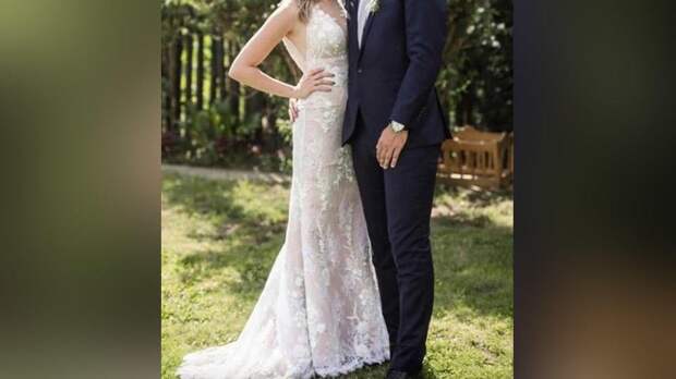 В Сети один пользователь разместил снимок, на котором позирует пара. Мужчина одет в темно-синий костюм и белую рубашку, а вот его спутница выбрала для мероприятия светлое длинное платье в пол со шлейфом и глубоким декольте.