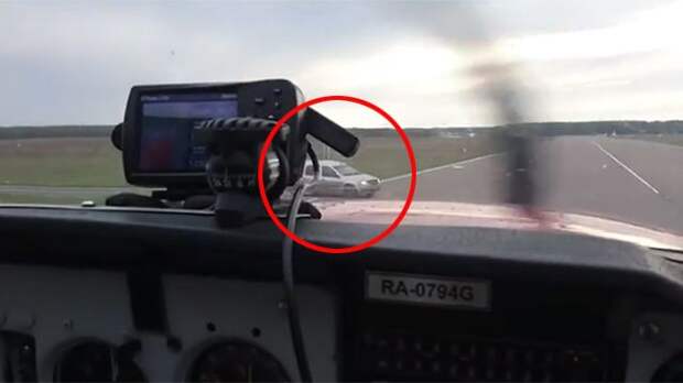 На кадрах видно, как легкомоторный самолет зашел на посадочную полосу, но неожиданно на нее выехал автомобиль. Пилоту самолета чудом удалось избежать столкновения.