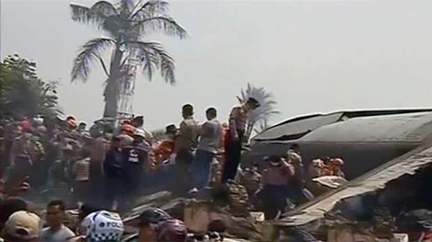 Появились шокирующие кадры последствий крушения военного самолета в Индонезии