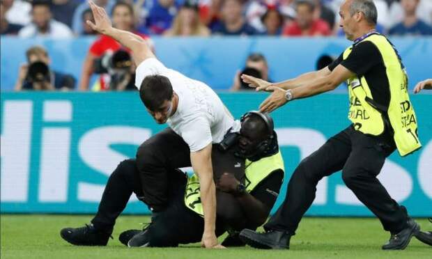 В начале второго тайма финального матча чемпионата Европы между сборными Португалии и Франции на поле стадиона "Стад де Франс" выбежал болельщик.