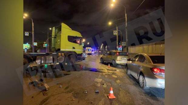 Фура и легковой автомобиль столкнулись в Санкт-Петербурге. Авария произошла на пересечении проспекта Маршала Жукова и Дороги на Турухтанные Острова.