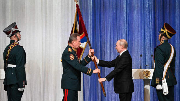 РИА Новости/Сергей Бобылев Президент России Владимир Путин вручил командующему войсками Росгвардии Виктору Золотову личный штандарт. Торжественная церемония состоялась 27 марта в честь Дня войск национальной гвардии РФ.