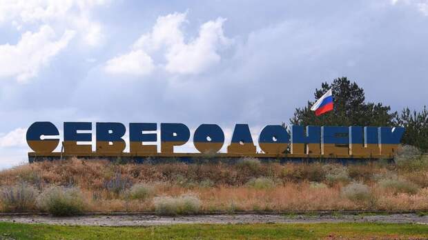 Стелу "Северодонецк" на въезде в освобожденный город в Донбассе перекрасили в цвета флага РФ. Об этом сообщает РИА Новости.