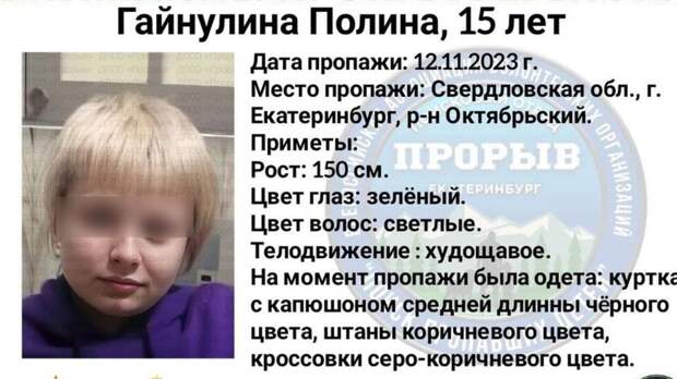 Пятый день в Екатеринбурге ведут поиски 15-летней Полины Гайнулиной, пропавшей 12 ноября. Об этом сообщили в региональном отделении поискового отряда "Прорыв".
