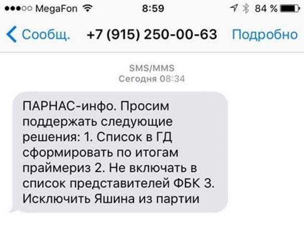 В субботу партию ПАРНАС обвинили в рассылке смс-сообщений с указаниями не поддерживать в ходе предварительного голосования кандидатов от ФБК, а также исключить Илью Яшина из Партии.