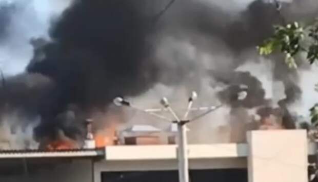 На кадрах видны языки пламени, поднимающиеся от ресторана.