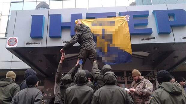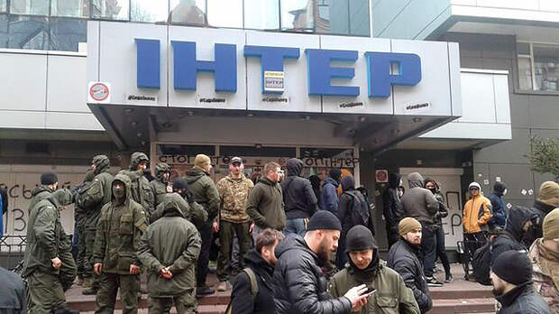 Бойцы карательного батальона "Азов" (запрещенная в России организация) штурмуют здание телеканала "Интер" в Киеве.