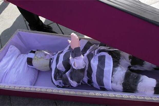 Участники акции пронесли по площади гроб с надувной куклой, одетой в полосатую робу. На лицо была наклеена фотография главы Национального банка Украины (НБУ) Валерии Гонтаревой.