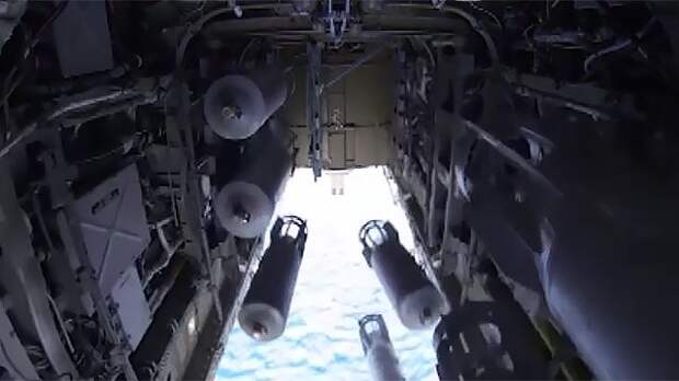 Представители Минобороны опубликовали видео, на котором запечатлен боевой вылет бомбардировщиков Ту-22М3. Шесть самолетов нанесли авиаудары по позициям ИГИЛ в окрестностях города Дейр-эз-Зор в Сирии.
