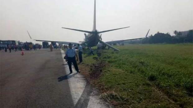 В Сети появились кадры с места ЧП в Индонезии, где за пределы взлетно-посадочной полосы выкатился малайзийский Boeing 737 авиакомпании Malindo Air.