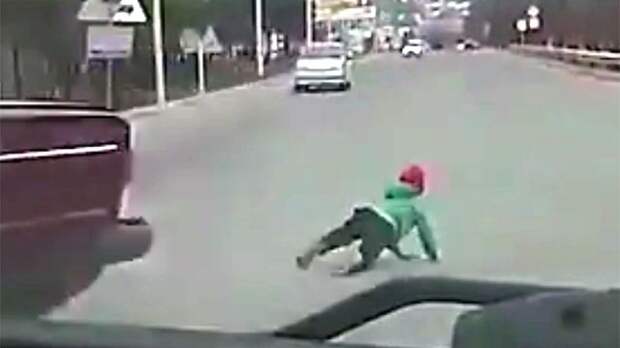 На кадрах запечатлено, как легковушка совершает резкий поворот и с заднего сиденья прямо на дорогу падает маленький ребенок. Малыш встает на ноги, однако машина, из которой он выпал, даже не останавливается – видимо, водитель не увидел, что произошло.