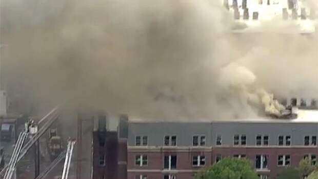 Пожарные расчеты округа Принс-Джордж тушат сильнейший пожар в строящемся здании вблизи кампуса университета в Мэриленде.