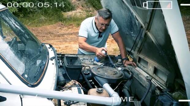 На случай, если автомобиль заглохнет прямо в бассейне, ведущий заранее подготовил трос. При помощи него машину можно будет быстро выдернуть.