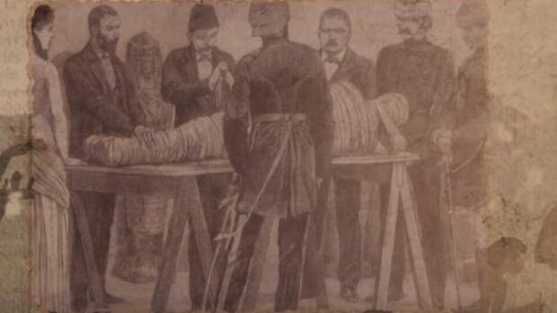 В программе показали, как примерно выглядел процесс "распаковки" мумии. Такие представления в 19-м веке устраивал в своем доме лондонский хирург Томас Петтигрю. Он публично разворачивал и вскрывал египетские мумии для развлечения гостей. Анатомические шоу собирали сотни зрителей.