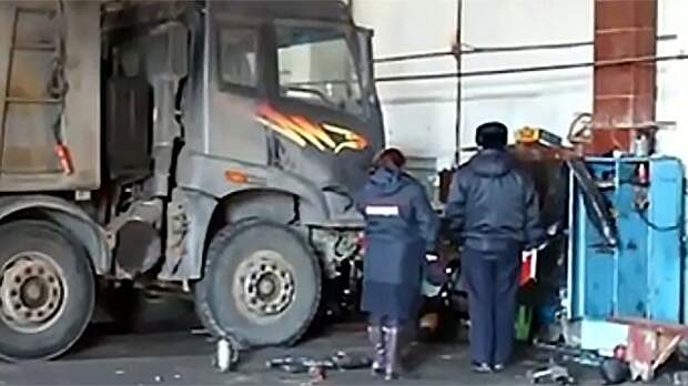 Мужчина ремонтировал тягач в гараже, но внезапно автомобиль начал двигаться, и слесаря прижало бампером к рабочему столу. Судя по всему, у него не было шансов на спасение — заметно, от удара на передней части машины осталась вмятина.