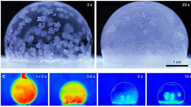 И вот спустя 70 лет ученые нашли объяснение тому, что заставляет растущие ледяные кристаллы внутри пузыря кружиться по всей поверхности, делая его похожим на встряхнутый снежный шар. Так, при соприкосновении пузыря с холодной поверхностью мыльная жидкость стекает по его стенкам, а через секунду образуются мелкие кристаллы льда, которые уносятся вверх поднимающимися потоками жидкости. Далее сотни кристаллов кружатся на поверхности пузыря, продолжая расти, пока не замерзнет весь пузырь.