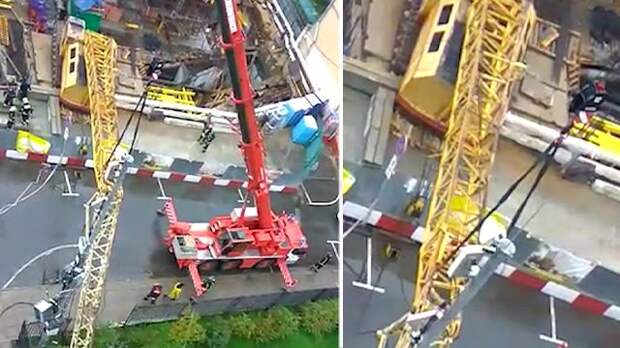 В распоряжении РЕН ТВ появились кадры, на которых рабочие при помощи крана пытаются поднять еще один кран, упавший на территорию детского сада в Москве.