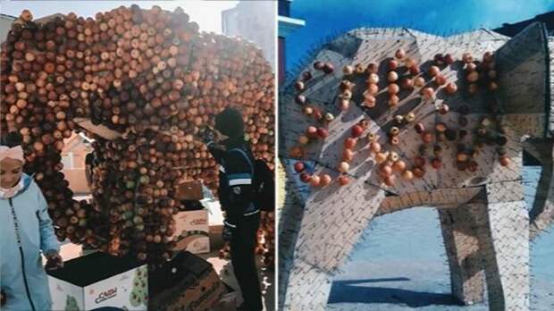 К празднику на центральной площади установили несколько съедобных арт-объектов: слона из яблок и дерево с кроной из сахарной ваты.