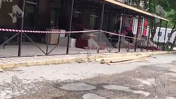 Инцидент произошел днем 11 мая. Как видно на записи с места ЧП, территория кафе "Золотая турка" оцеплена, на месте работают сотрудники правоохранительных органов.
