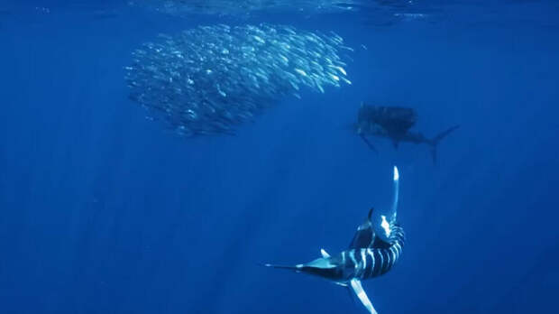 Полосатые копьеносцы или марлины тоже охотятся совместно. Они гонят стаю и на большой скорости влетают в косяк преследуемых рыб. Ученые отметили, что перед финальной атакой тело марлина меняет окраску и становится более ярким, а затем тускнеет, когда охота заканчивается.