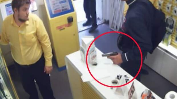 А потом один из них начинает угрожать сотрудникам пистолетом, пока сообщник закрывает двери от нежелательных гостей.