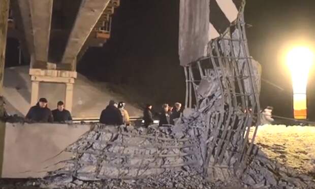 На кадрах видно, что опора моста деформирована. Конструкция изогнулась.