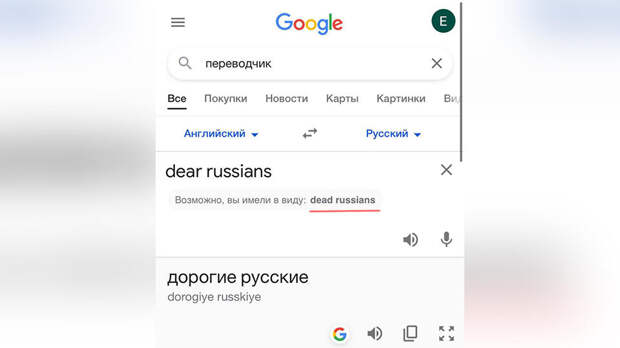 Google-переводчик стал выдавать за ошибку фразу "дорогие русские", написанную на английском языке. Сервис предлагает заменить первое слово на "мертвые".