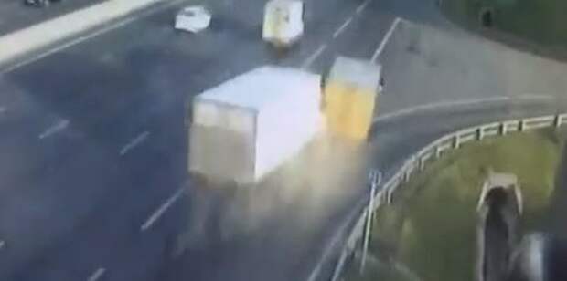 ДТП с двумя фурами произошло на МКАД. Как видно на кадрах, фуры двигались в попутном направлении.