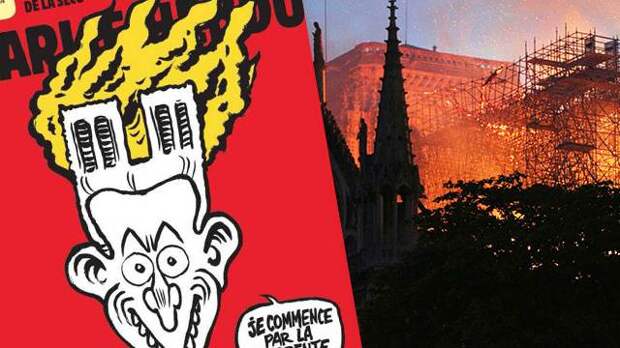 Скандально известный своими насмешками над трагедиями французский сатирический журнал Charlie Hebdo выпустил карикатуру на пожар в соборе Парижской Богоматери.