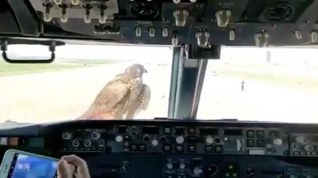 Пилоты самолета стали очевидцами необычного инцидента: сокол прилетел на территорию аэропорта и приземлился прямо на носовую часть воздушного судна, перед лобовым стеклом. Инцидент произошел в Мексике. Птица спокойно села прямо напротив приборной панели и всем своим видом показала, что не намерена улетать никуда.