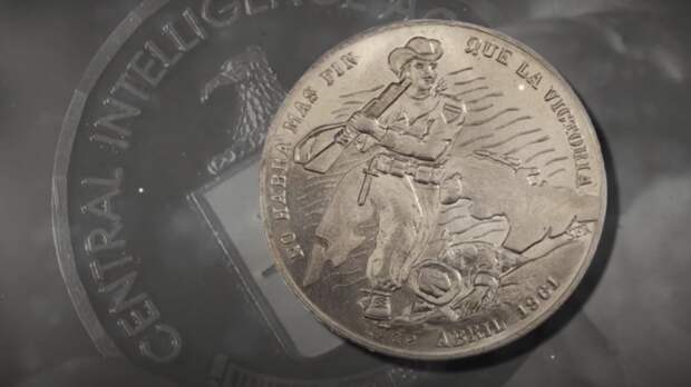 Фото: Скриншот видео Рен тв ЦРУ рассекретило данные о серебряной монете, выпущенной правительством США в 1961 году перед операцией по свержению Фиделя Кастро. На аверсе размещен контур Кубы и десантник над поверженным врагом. Реверс содержит изображение креста и кубинского флага. Надписи на английском и испанском гласят: «Нет исхода, кроме победы».