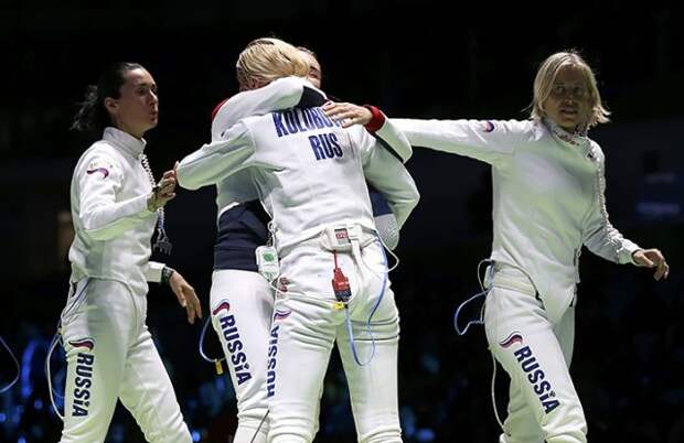 Российские шпажистки Виолетта Колобова, Татьяна Логунова, Любовь Шутова и Ольга Кочнева выиграли бронзовые медали в командных соревнованиях на Олимпийских играх в Рио-де-Жанейро, победив эстонских спортсменок со счетом 37:31.