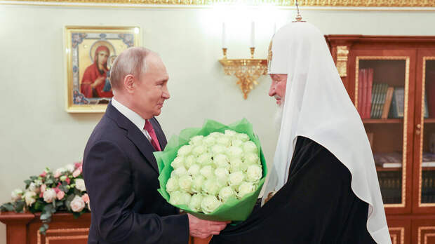 Путин вручил патриарху букет белых роз и поблагодарил его за труды на посту предстоятеля Русской православной церкви.