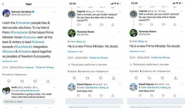 Видимо, осознав свою ошибку, Харадинай отредактировал твит. Он убрал имя будущего "премьер-министра" и оставил лишь слова поддержки "своему другу Петро Порошенко".