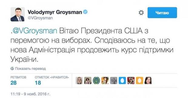 СМИ сообщили об очередном конфузе в Киеве. Премьер-министр Украины Владимир Гройсман по ошибке поздравил с победой на выборах президента США Барака Обаму вместо Дональда Трампа. Он разместил свое поздравление в Twitter.