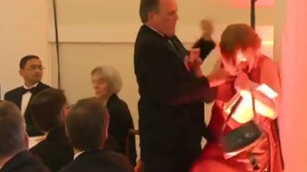 Британский министр Марк Филд, представляющий Форин-офис, вытолкал из банкетного зала особняка в Лондоне эко-активистку.
