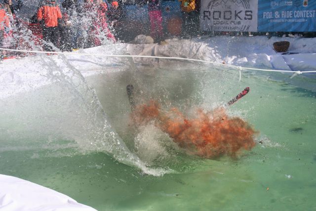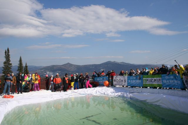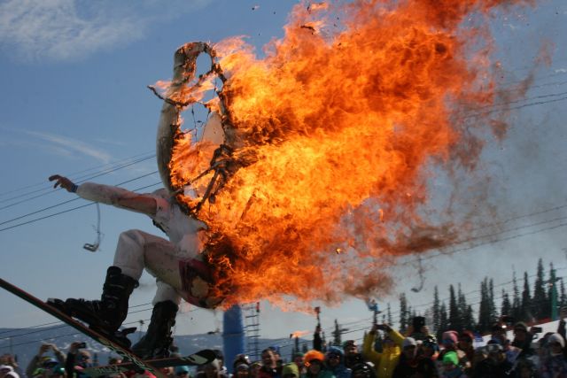 На выступлении на горнолыжном курорте Шерегеш один из лыжников поджег свой карнавальный костюм перед прыжком в бассейн и, полностью объятый пламенем, после прыжка на трамплине влетел в бассейн.