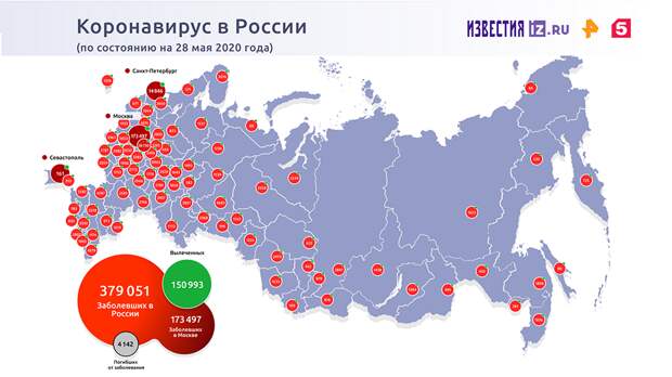 В России зафиксировано 379 051 случай заболевания, 4142 человека умерли, 150 993 излечились.