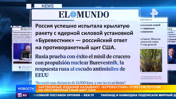 Испанская газета Эль Мундо называет "Буревестник" ответом России на противоракетный щит США. Это сложная система перехвата с привлечением спутников, которую недавно "пиарил" президент Соединенных Штатов Дональд Трамп и которая пока еще только в стадии разработки.