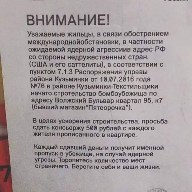 В листовках говорится о том, что "в связи с обострением международной обстановки, в частности ожидаемой агрессии в адрес РФ со стороны недружественных стран просьба сдать консьержу 500 рублей с каждого жителя" на строительство бомбоубежища.
