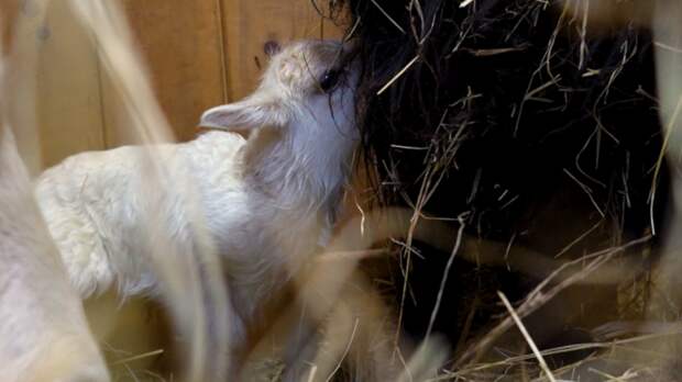 Ягненок появился на свет бойким и достаточно крепким, однако первые 1–1,5 часа у него не получалось найти вымя матери, поэтому он предпринял попытку поесть у соседки по домику — Нуги, но потом барашек приспособился. Сейчас детеныш сильно подрос и начал много играть.