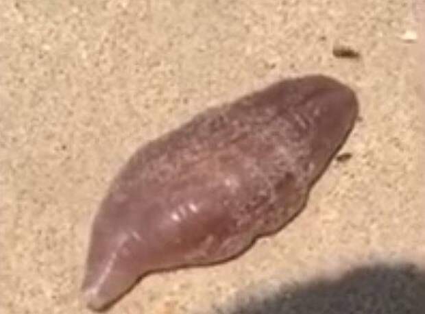 На кадрах видеозаписи видно, что существо розоватого цвета, судя по всему, выбросило на берег волнами.