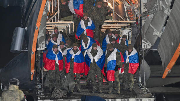 После долгих месяцев в плену 157 российских бойцов снова дома. На летном поле развернули российский флаг.