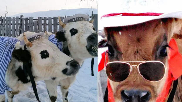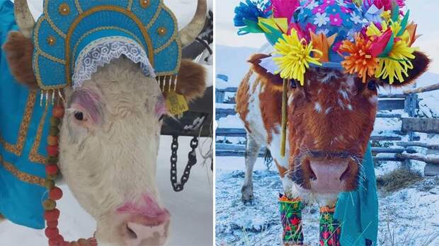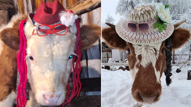Юзеры принялись делиться снимками в своих соцсетях.Так, на одном из фото "рогатая красавица" одета в яркий кокошник, бусы и голубую накидку. Другая же модница примерила на себя образ, похожий на наряд знаменитой актрисы Одри Хэпберн - животное одето в белую широкополую шляпу, темные солнцезащитные очки, а на шею ей повязали кокетливый красный шарфик.