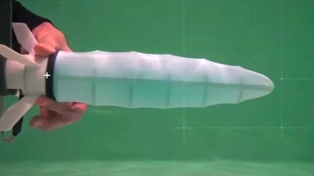 Скриншотв идео "Наш двигатель функционирует так же. У него нет накопителя энергии. Мы просто напечатали на 3D-принтере обтекаемый корпус из поликарбоната. Через эластичную мембрану он втягивает воду и надувается, как воздушный шар. А затем быстро выдавливает ее, и это создает тягу", – пояснил профессор океанологии и инженерии Массачусетского технологического института Майкл Триантафиллоу.